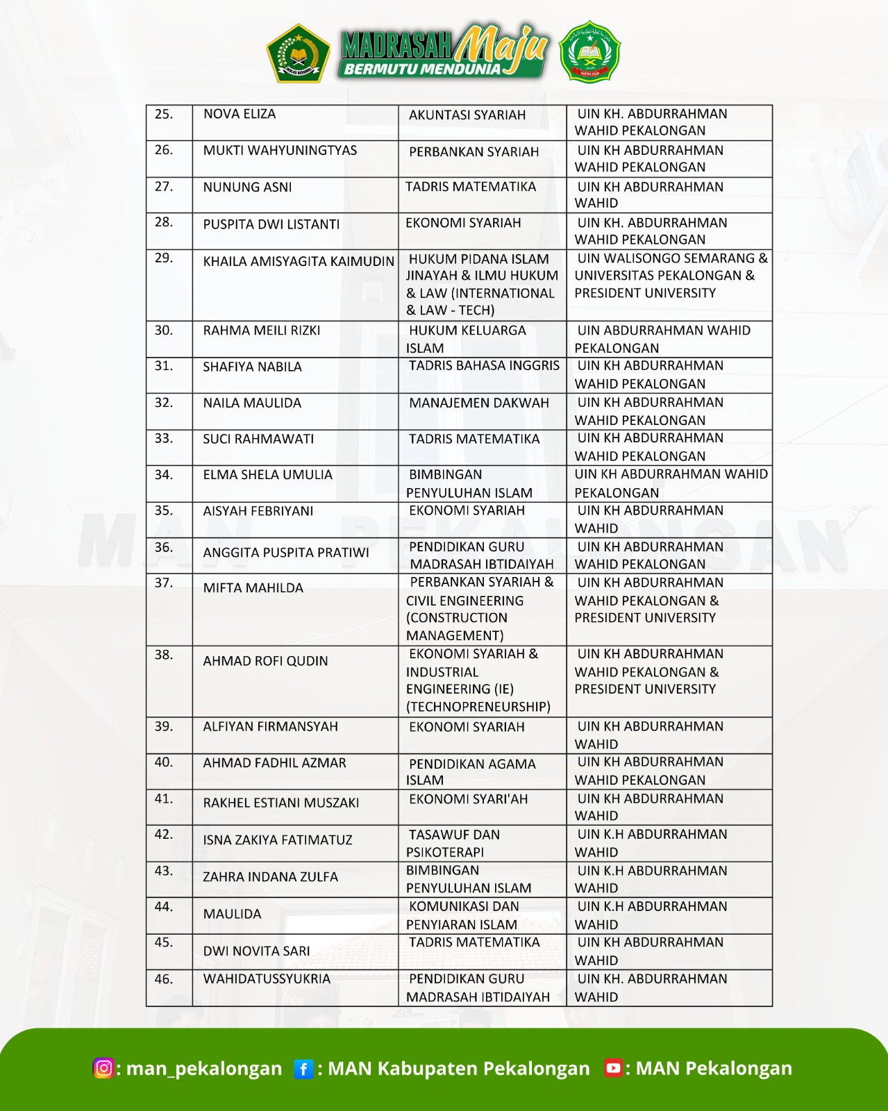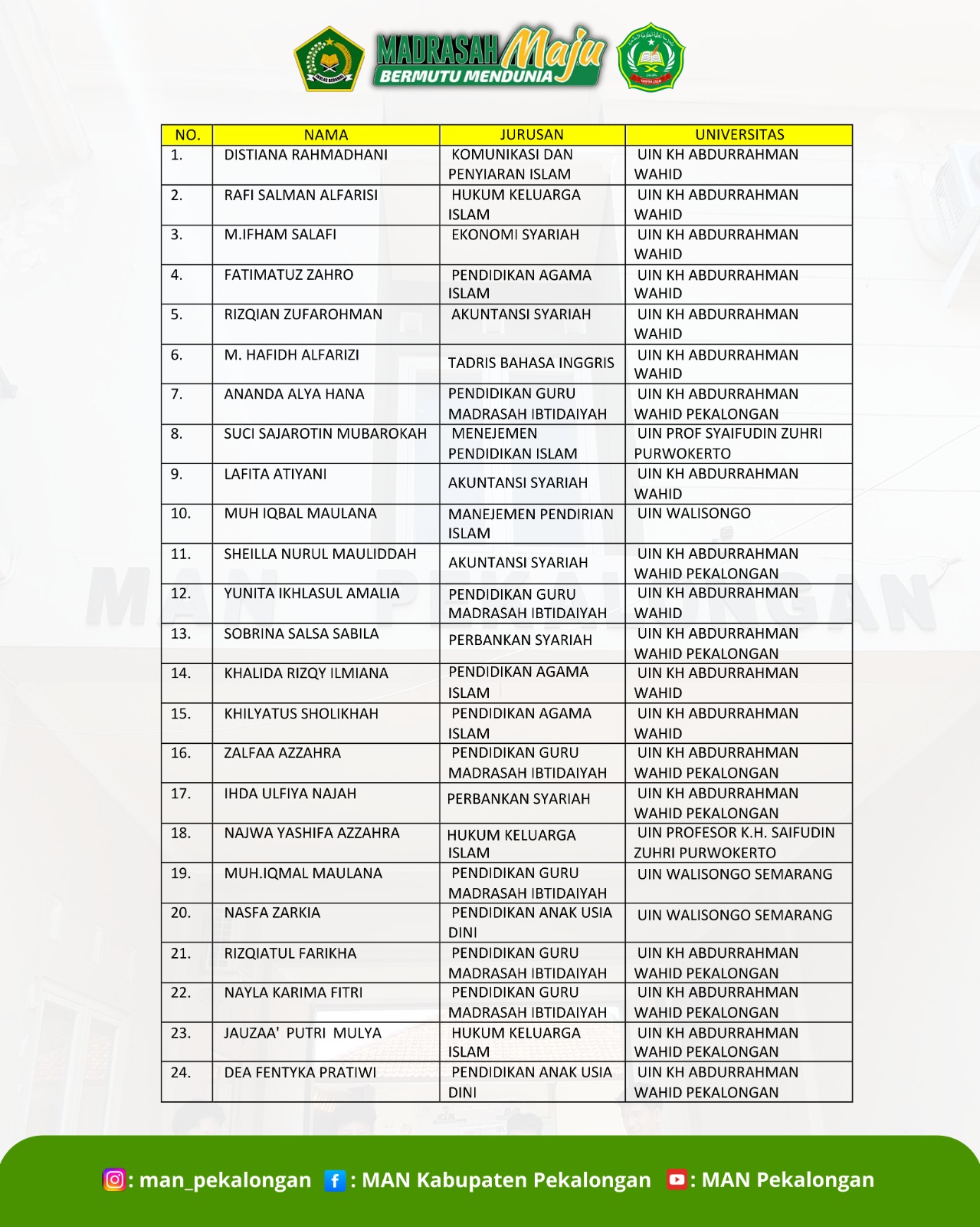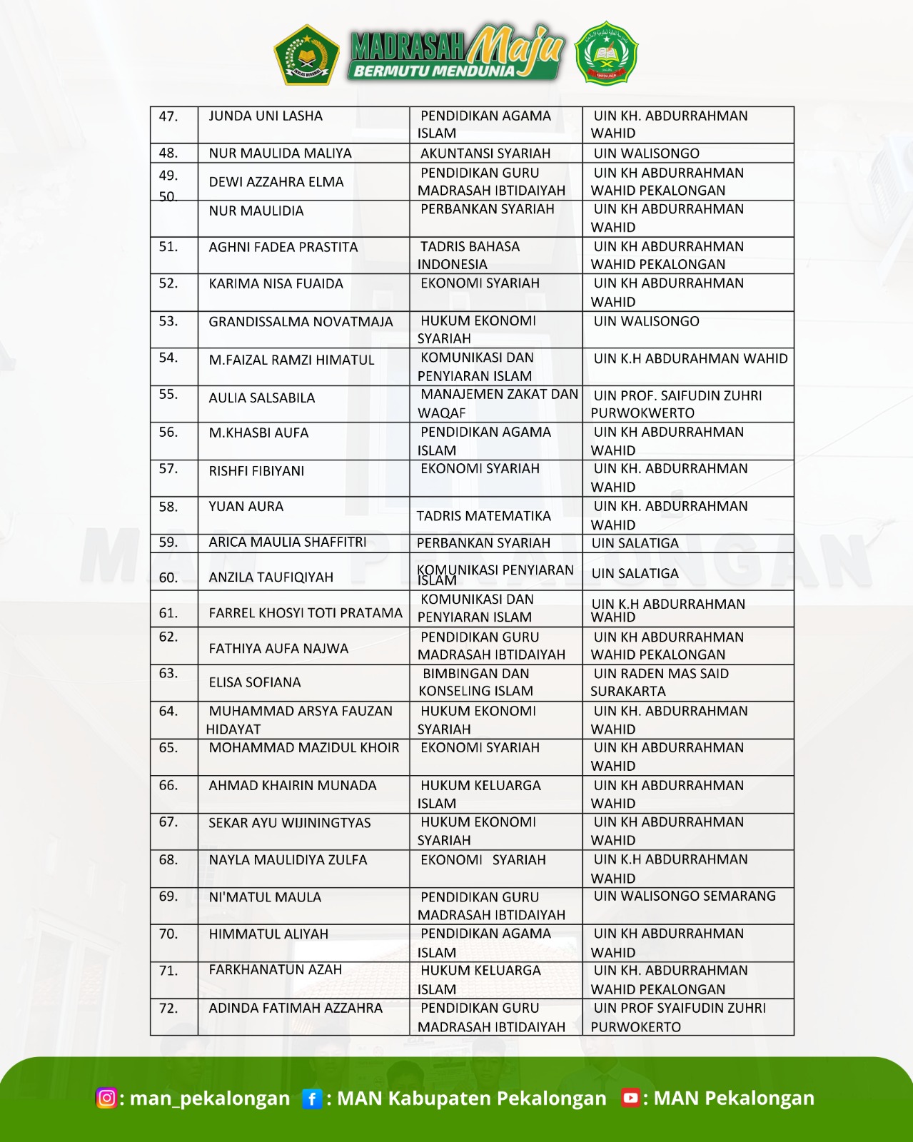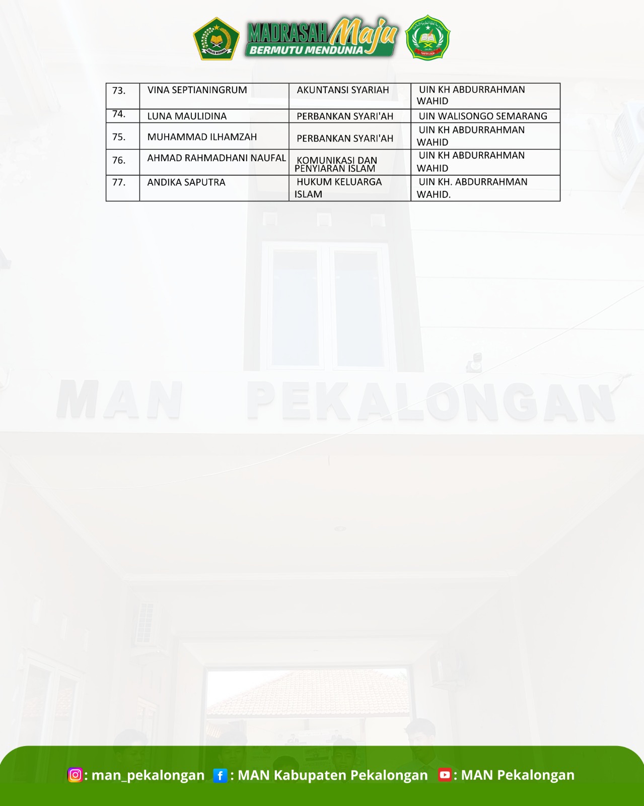 Selamat atas keberhasilan siswa siswi man Pekalongan yang lolos jalur SPAN PTKIN 2025