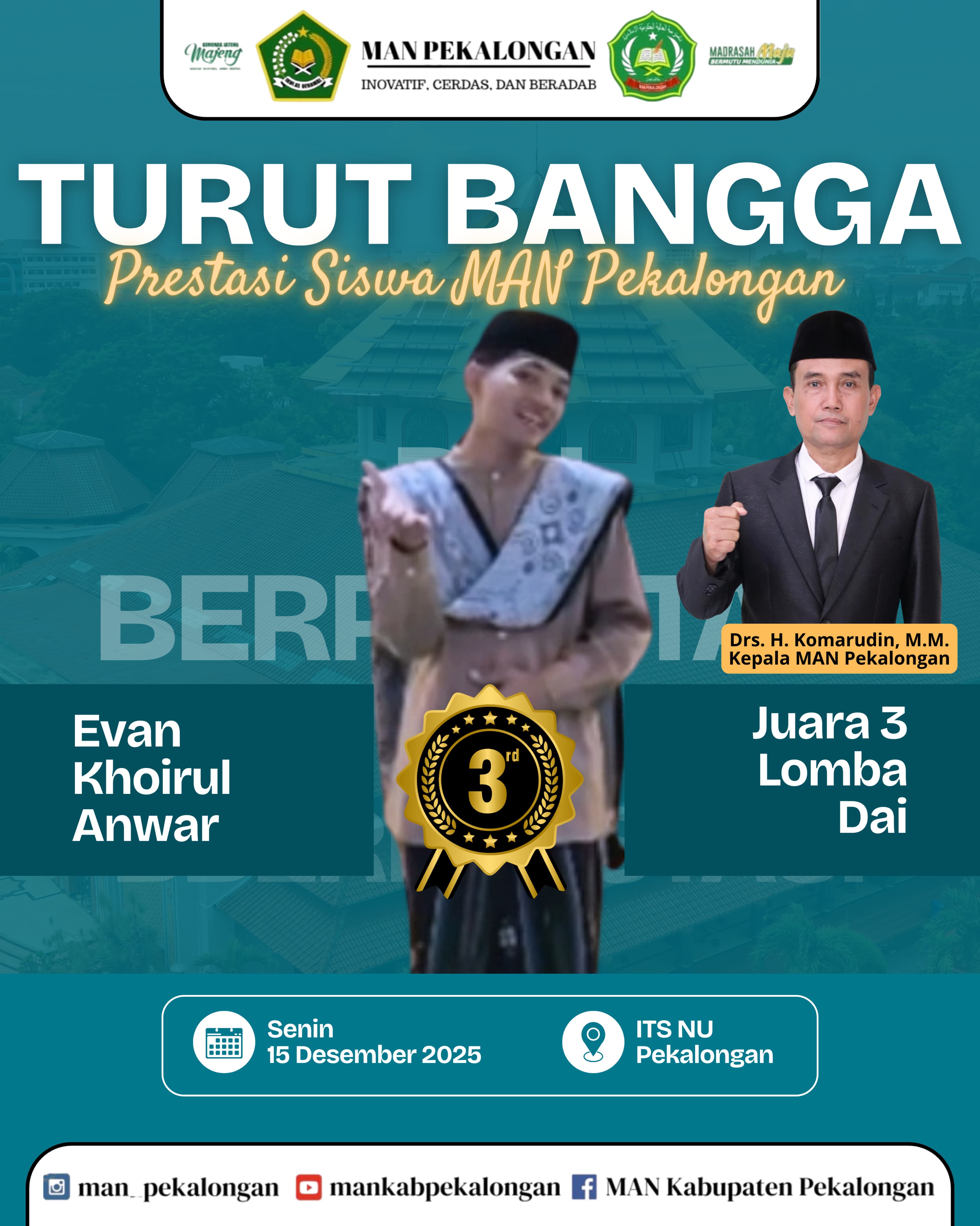 *Siswa MAN Pekalongan Raih Juara III Lomba Da'i Online ITSNU Pekalongan* Kedungwuni- Evan Khoirul Anwar, siswa MAN Pekalongan, berhasil meraih Juara III dalam Lomba Da'i Online ya [...]