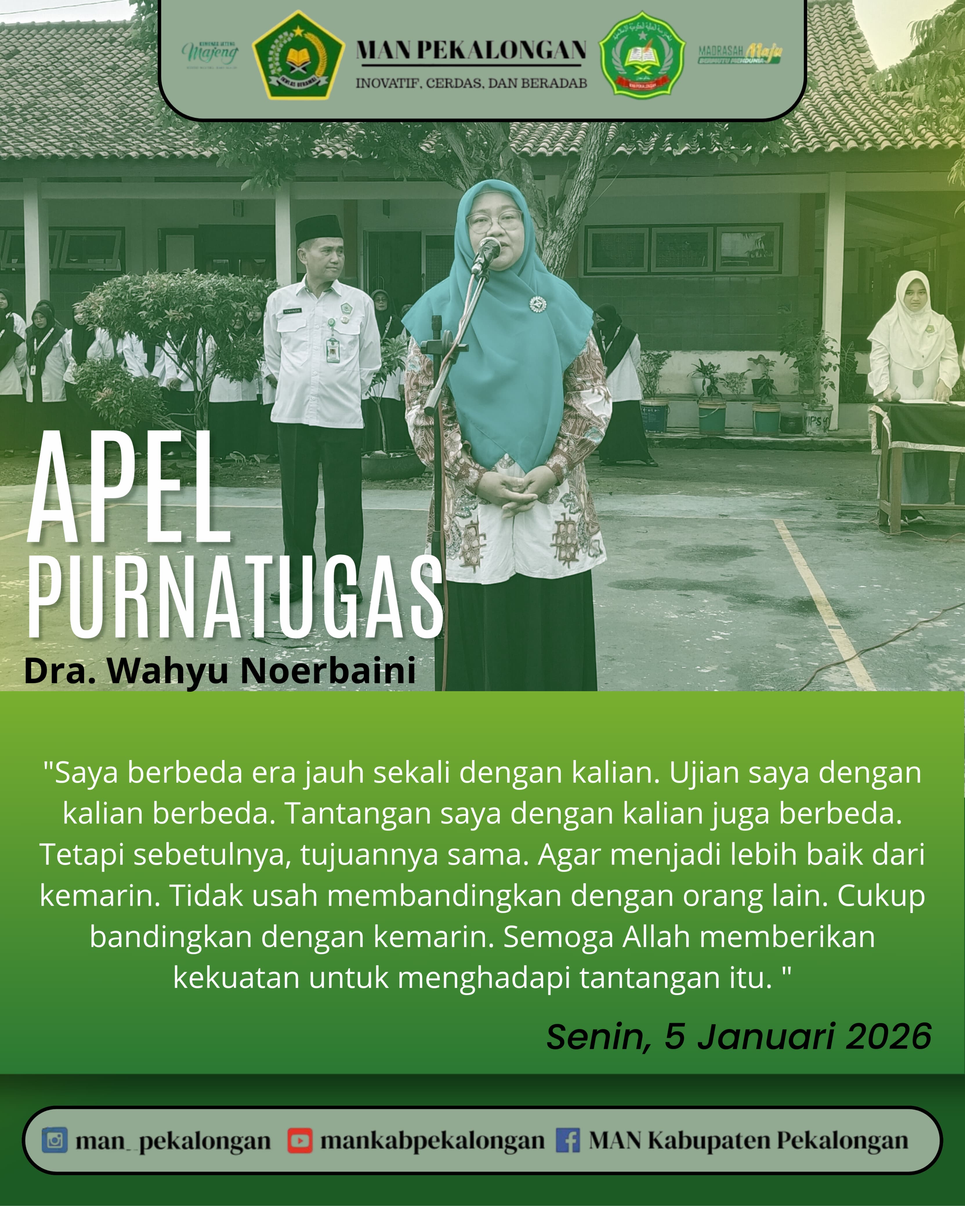Apel Purnatugas Dra. Wahyu Noerbaini KEDUNGWUNI-SENIN, 5 JANUARI 2025 MAN Pekalongan melaksanakan apel purnatugas untuk Ibu Dra. Wahyu Noerbaini, yang memasuki masa purnabakti per tanggal 1 [...]