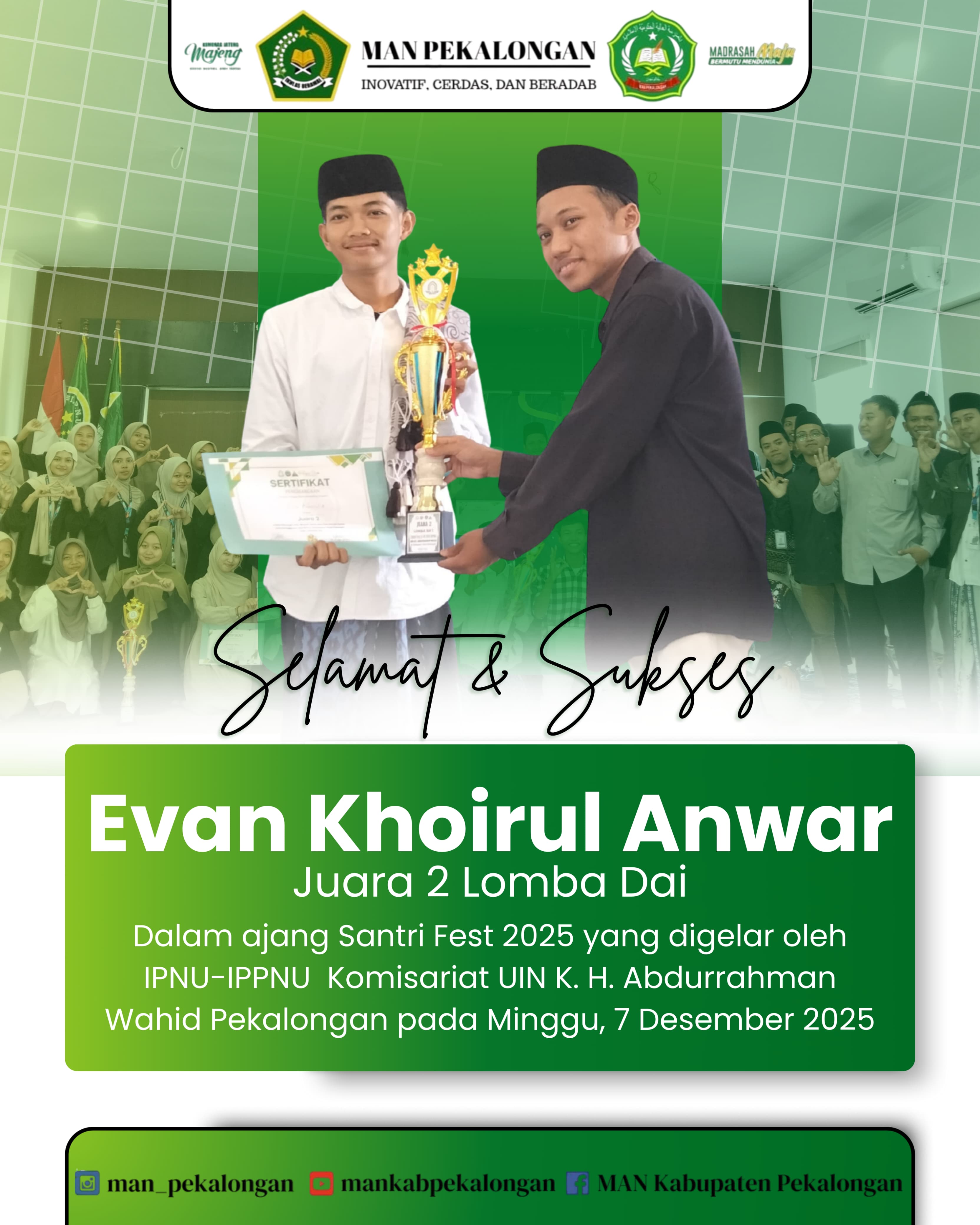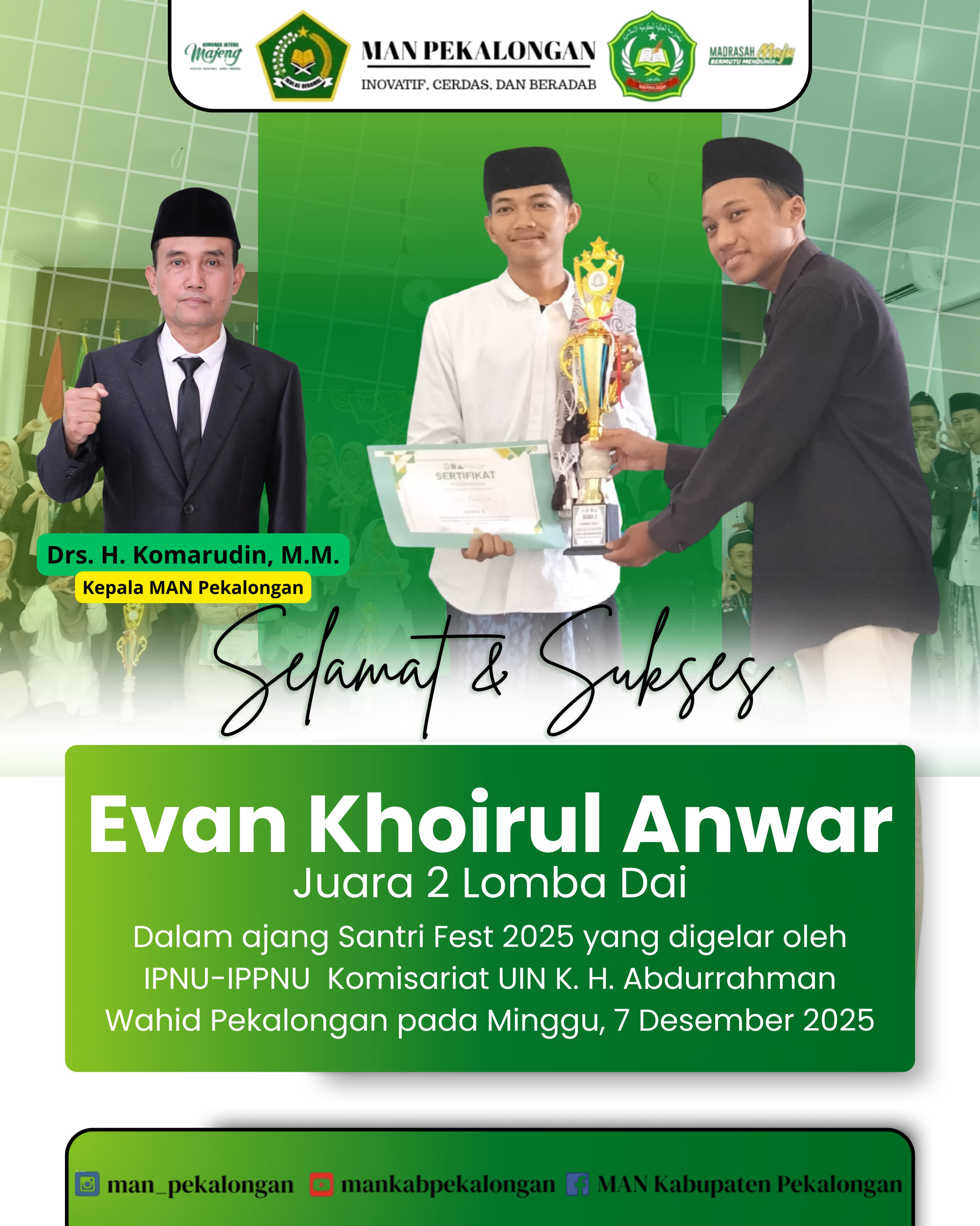 Sang Dai yang Sarat Prestasi KAJEN-MINGGU, 7 DESEMBER 2025 Peserta didik MAN Pekalongan kembali menorehkan prestasi yang membanggakan. Evan Khoirul Anwar, siswa kelas XII 2, berhasil m [...]