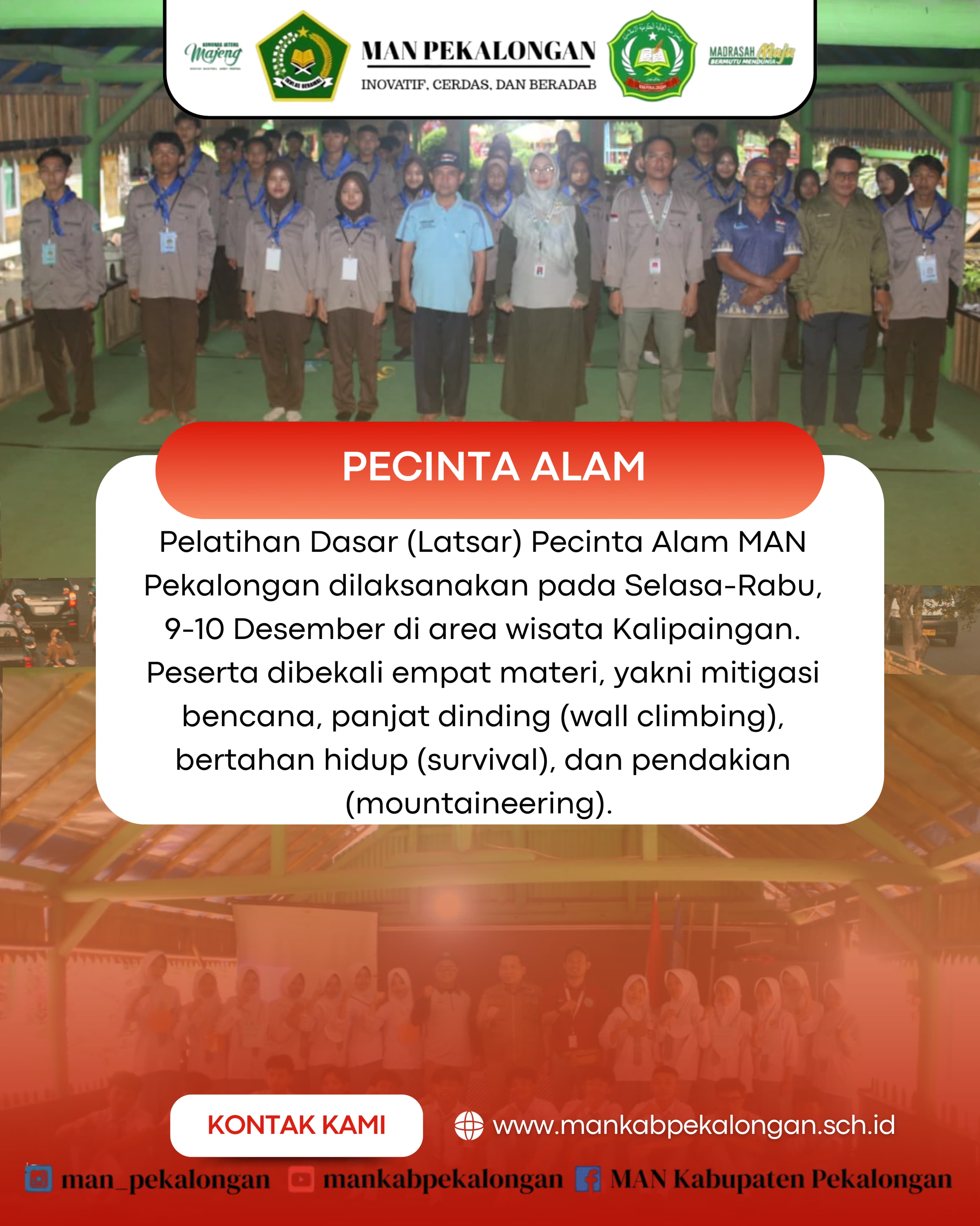 Pelatihan Dasar Sismanpala MAN Pekalongan KAJEN-11 DESEMBER 2025 Ekstrakurikuler Pecinta Alam MAN Pekalongan melaksanakan kegiatan Pelatihan Dasar pada Selasa-Rabu, 9-10 Desember [...]