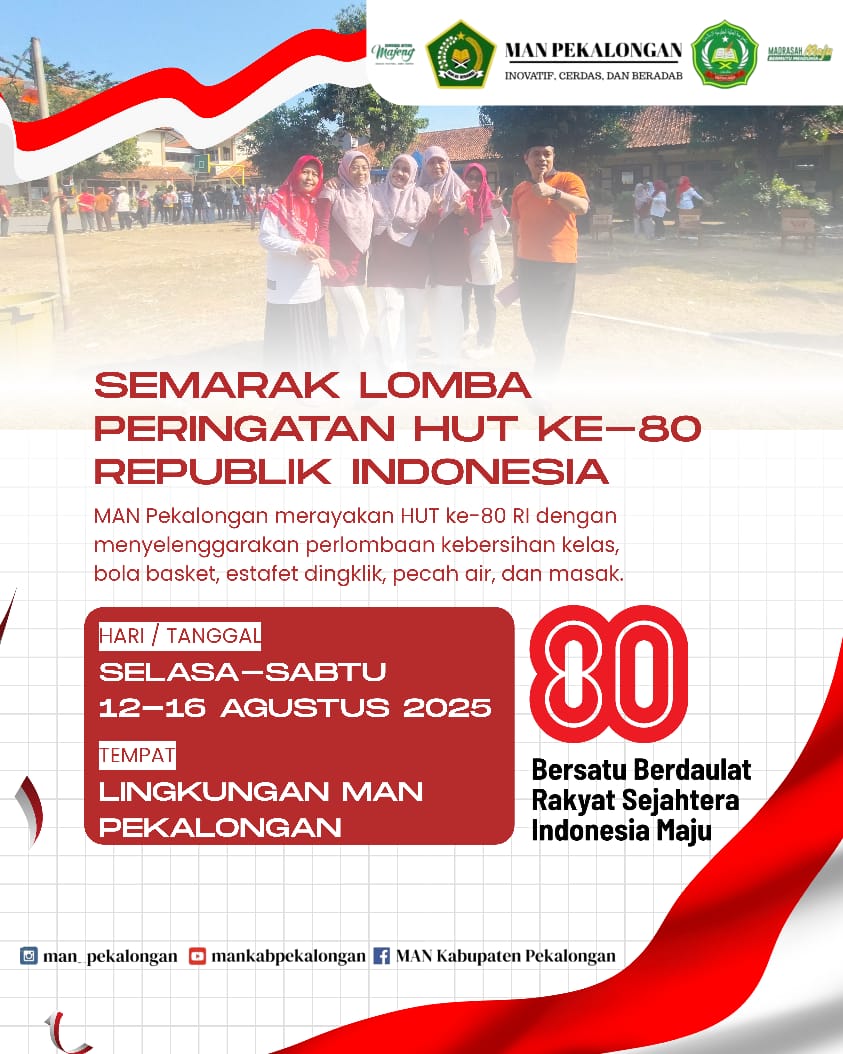 Semarak Lomba KEDUNGWUNI- SABTU, 16 AGUSTUS 2025 Dalam rangka menyemarakkan peringatan HUT ke-80 Republik Indonesia, MAN Pekalongan menggelar aneka perlombaan. Pertama, tangg [...]